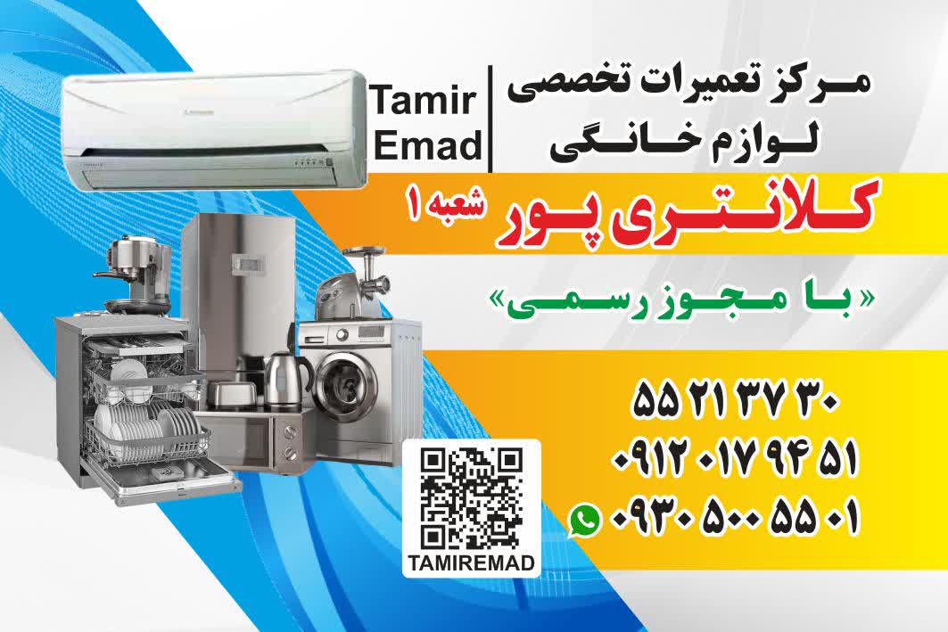 تعمیر عماد به عنوان یکی از معتبرترین شرکت های خدمات لوازم خانگی در ایران،تحت نظارت سازمان اصناف و اتحادیه های لوازم خانگی و صنعتی میباشد.از ویژگی های تعمیر عماد،میتوان پشتیبانی قوی،کارشناسان مجرب،تعمیرات برند های مطرح ایرانی از جمله اسنوا،پاکشوما،جی پلاسو…اشاره کرد.تخصص شرکت تعمیر عماد لوازم خانگی است.پس برای تعمیر لوازم منزل از جمله لباس شویی،ظرفشویی،یخچال و ساید،کولر گازی،ماکروفر وسولاردم،پکیج،جاروبرقی،پنکه،چرخ گوشت،اسپرسو ساز،چایی ساز،اتو،اتومو،اتو پرس،پلو پز،ایرفایر،سشوارو دیگر لوازم خانگی با ما در ارتباط باشید.جهت کسب اطلاعات بیشتر با شماره تماس 55213730(021) در ارتباط باشید